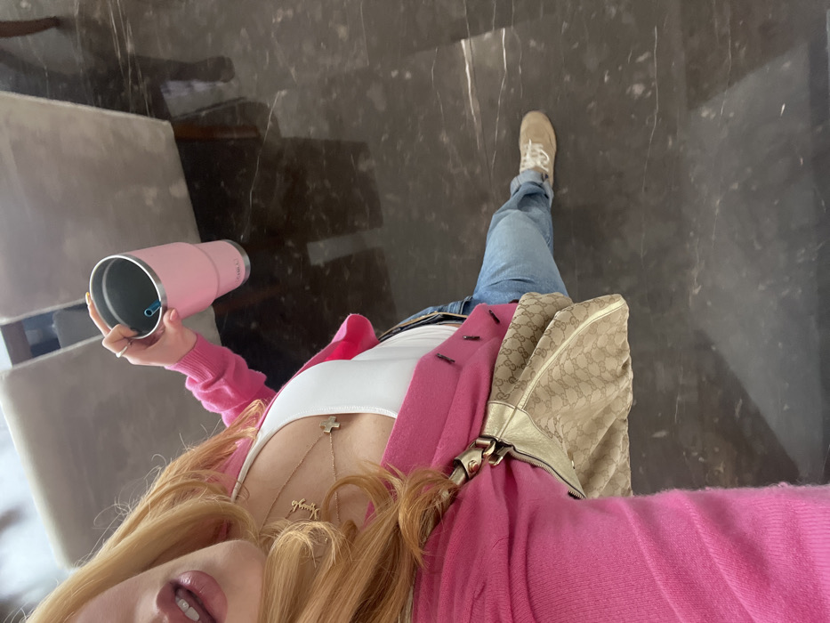 The image depicts an individual in an indoor setting located in Santiago Yancuitlalpan, Mexico. The subject, an adult female, is shown from a high-angle perspective, focusing on her upper torso down to her feet. She has long, light blonde hair and visible glossy lips. She is wearing a white sleeveless top under a bright pink long-sleeved cardigan. Around her neck, two gold-toned necklaces are visible: one featuring a cross-shaped pendant and another with an illegible scripted pendant. A tan-colored shoulder bag with a repeating logo pattern is visible on her left side. She is wearing light blue denim jeans and light brown lace-up shoes. Her left hand holds a large pink tumbler with a blue straw; the tumbler bears the visible branding "OLLILA" near its base. A ring is present on her left ring finger. The immediate environment features a dark, highly polished and reflective floor, likely stone or marble, which shows distinct reflections of the subject's lower body and background elements. In the blurred background, partial views of two light-colored upholstered chairs with dark wooden legs are visible.