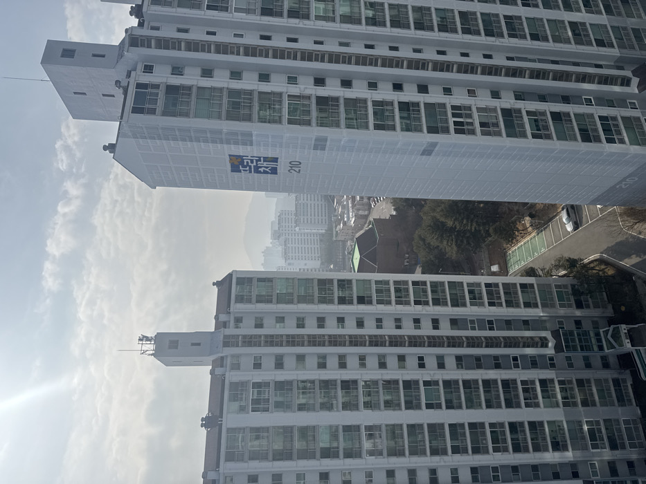 Two tall apartment buildings dominate the frame, their identical facades stretching vertically with rows of windows. The buildings feature flat rooftops and extended sections on their sides. A hazy urban landscape of more distant buildings appears in the background, with trees and roads visible between the close buildings. The sky is overcast, with a bright sun obscured behind clouds.