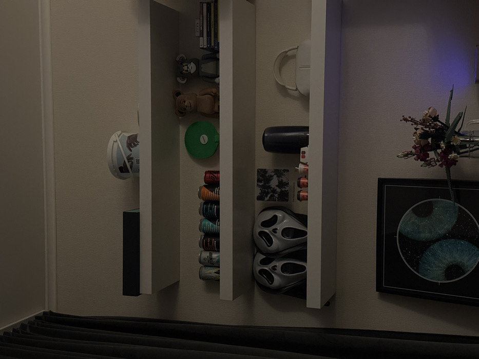 The scene depicts a section of an indoor wall with three white floating shelves displaying various objects. A dark gray curtain is visible along the left edge of the frame. The walls are light beige, and a white crown molding runs along the top of the wall where it meets the ceiling. This location is identified as Novoe Devyatkino, Russia. On the top shelf, from left to right, a dark rectangular box rests beside a white plastic bucket adorned with an illustration of two hands reaching towards each other. The middle shelf features a row of six beverage cans; the first two are light-colored, followed by three darker cans with colored designs, and one reddish-orange can. To their right is a green circular object with a white center, then a brown bear-like figurine and a gray cat-like figurine. A small stack of items, appearing to be media cases, is positioned at the far right. The bottom shelf displays two white "Ghostface" masks, side-by-side, followed by a square piece of art or photograph depicting dark foliage against a lighter background. Below this art, a small white plaque with illegible text is visible. Three miniature cups with character faces are arranged next to a small white rectangular object. Further right, a dark cylindrical object stands next to a pair of white over-ear headphones. Below the shelves, a framed artwork featuring a circular image of two large, textured blue-green shapes resembling eyes against a starry black background is mounted on the wall. To its right, a clear vase holds an arrangement of artificial flowers and foliage in various colors, predominantly red, orange, and green. A faint purple light glow is cast upon the wall to the right of the floral arrangement. The overall lighting is dim and ambient, suggesting an interior space illuminated by artificial light sources not directly visible within the frame.