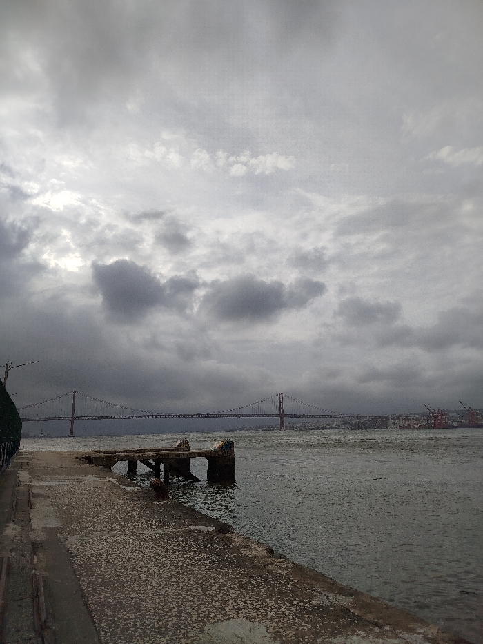 The image depicts a waterfront scene in Almada, Portugal, looking across the Tagus River towards Lisbon on an overcast day. The upper two-thirds of the frame are dominated by a heavy, dark grey, cloud-laden sky, with a brighter patch visible to the left indicating obscured sunlight. In the foreground, a concrete embankment or walkway runs along the left side, transitioning into a rough, discolored concrete surface that occupies the lower quarter of the image. Extending from this surface into the water is a derelict concrete pier or platform, supported by several visible concrete pillars, some partially submerged. The concrete shows significant weathering, flaking, and discoloration; graffiti is visible on one of the pier's vertical supports. A dark green mesh fence is partially visible on the far left edge of the frame. The middle ground is filled by the choppy, dark grey waters of the Tagus River. Spanning the river in the mid-to-background is the red 25 de Abril Bridge, a large suspension bridge with its towers and cable network distinctly visible against the sky. To the right of the bridge, on the distant shore, an industrial port area is discernible, featuring multiple red gantry cranes and obscured city structures. No individuals or active interactions are present in the scene.