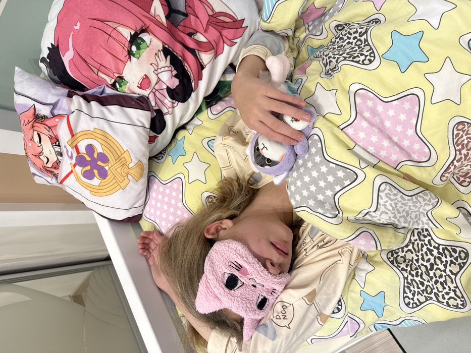A person sleeps in a bed. They wear a pink cat-shaped eye mask. The yellow bedding has stars and animal print. The person clutches a small purple and white plush toy. Next to the sleeper are two anime-themed pillows; one features a pink-haired character, and the other has a pink-haired character and a purple and gold symbol. The bed has white side rails.