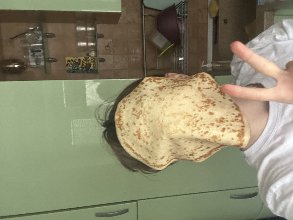 A person, facing the camera, has a large crepe covering their face. Their hand is making a peace sign near the top right corner. They wear a white shirt. The background shows a kitchen setting with pale green cabinets and a tiled backsplash. A dish rack with various bowls and cooking utensils is visible.