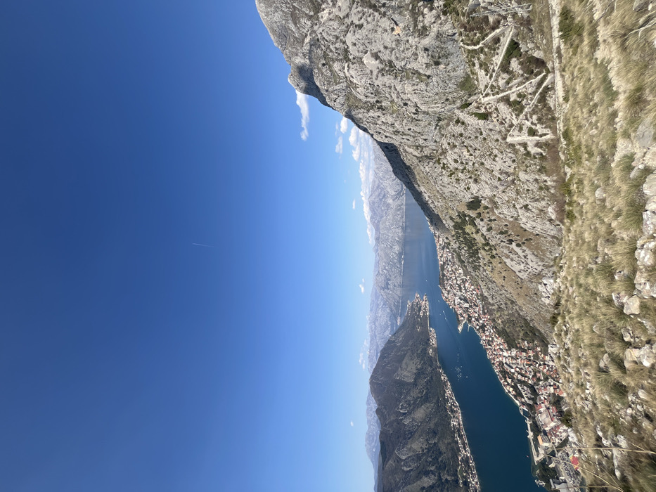 The image presents a panoramic landscape view from an elevated position in Špiljari, Montenegro, overlooking the Bay of Kotor. The scene is illuminated by bright daylight under a clear, deep blue sky, which occupies approximately two-thirds of the frame. A faint white aircraft contrail is visible in the upper right quadrant of the sky. The foreground consists of a rocky hillside covered with sparse, dry, yellowish-green grass and small stones. The midground features the deep blue waters of the Bay of Kotor, curving from the lower-left towards the center and extending into the background. Numerous small white specks, indicative of boats, are scattered across the water. Along the coastline at the base of the mountains, a town identified as Kotor is visible, characterized by a dense cluster of buildings with reddish-orange roofs. Steep, rocky mountains frame the bay. On the right, a prominent, rugged grey mountain slope descends towards the bay, exhibiting visible rock formations and sparse green vegetation. A winding, stone-lined path or road with multiple sharp switchbacks is carved into this mountain's face. On the left, another set of mountains, partially covered in green foliage and rock, borders the bay. In the distant background, hazy grey-blue mountains recede towards the horizon. No people or overt actions are discernible in the scene.