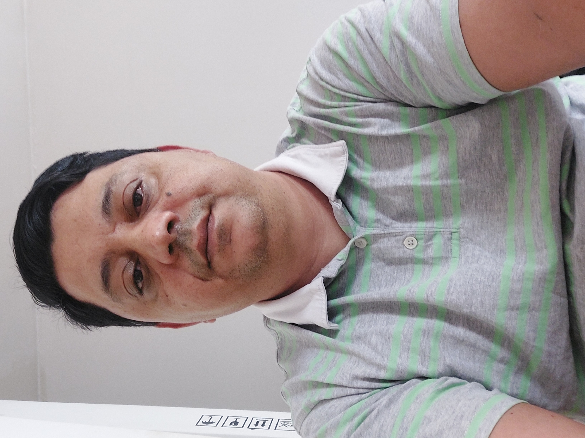 A head-and-shoulders portrait depicts an adult male, estimated to be in his 40s or 50s, with dark hair and medium skin tone, facing forward and looking directly at the camera