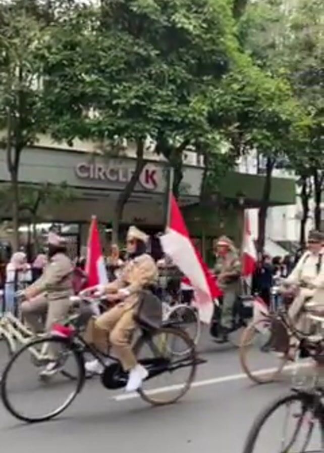 A street scene captures a parade of people on bicycles. Participants are dressed in what appear to be historical military or official uniforms, and each bike is adorned with an Indonesian flag. The setting is an urban environment, with a "Circle K" convenience store visible in the background, along with other shops and greenery. Observers line the edges of the street, watching the parade.