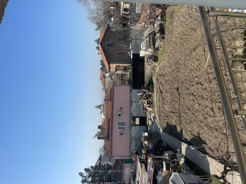 The image displays an elevated, static daytime view of a residential and garden area in Novi Iskar, Bulgaria, under a clear, cloudless blue sky. In the immediate foreground, a metallic railing and portions of bare tree branches are visible. The midground is largely occupied by a rectangular plot of tilled brown earth, consistent with a garden. To the left of this plot, a concrete pathway leads towards the background, flanked by an area containing stacks of corrugated metal sheets, assorted wood planks, miscellaneous construction debris, and a small, white, tent-like structure. Similar piles of materials and bare vegetation are present to the right of the tilled ground. A horizontal concrete block wall separates the garden area from the structures behind it. This wall incorporates a central black metal pedestrian gate and a larger, solid black metal gate or panel to its right. Directly behind the wall, a prominent two-story house with salmon-pink painted walls and a terracotta tiled hip roof stands. Its lower half, or foundation, is constructed from grey concrete. The upper floor displays a single window, beneath which two white exterior air conditioning units are mounted. A black metal entry gate is visible at the ground level of this house. To the right of the pink house, a two-story brown-colored house with a terracotta tiled gable roof and multiple windows is present. The distant background reveals additional residential buildings of various styles and roof types, intermingled with scattered trees, including both bare deciduous specimens and some conifers. No individuals are depicted in the scene.