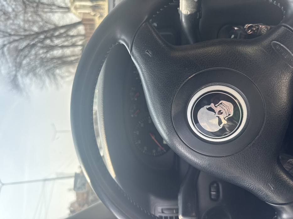The image displays an interior perspective from a vehicle, centered on the steering wheel and the view through the windshield. The foreground features a black, leather-wrapped steering wheel. Its central horn pad is adorned with a custom circular emblem depicting a metallic, light-toned skull, oriented slightly to the right, exhibiting distinct cranial and dental features. The word "AIRBAG" is embossed on the lower right spoke of the steering wheel. Behind the steering wheel, segments of the dashboard and instrument cluster are visible, including obscured gauge dials. A set of keys, one bearing a Volkswagen logo, hangs from the ignition, partially visible to the right of the steering column. Through the windshield, a hazy, bright sky dominates the upper background. The exterior environment includes a line of bare deciduous trees on the right side, indicating a dormant season. Vague architectural forms, likely buildings or structures, are faintly visible below the horizon. A tall, light-colored pole, possibly a utility or streetlight pole, is discernible in the distant left. The scene suggests an urban or suburban setting. The precise location within the city of Pazardzhik, Bulgaria, cannot be determined from the visual information provided. No individuals are depicted. The vehicle appears to be stationary or in motion under bright, diffuse lighting conditions.