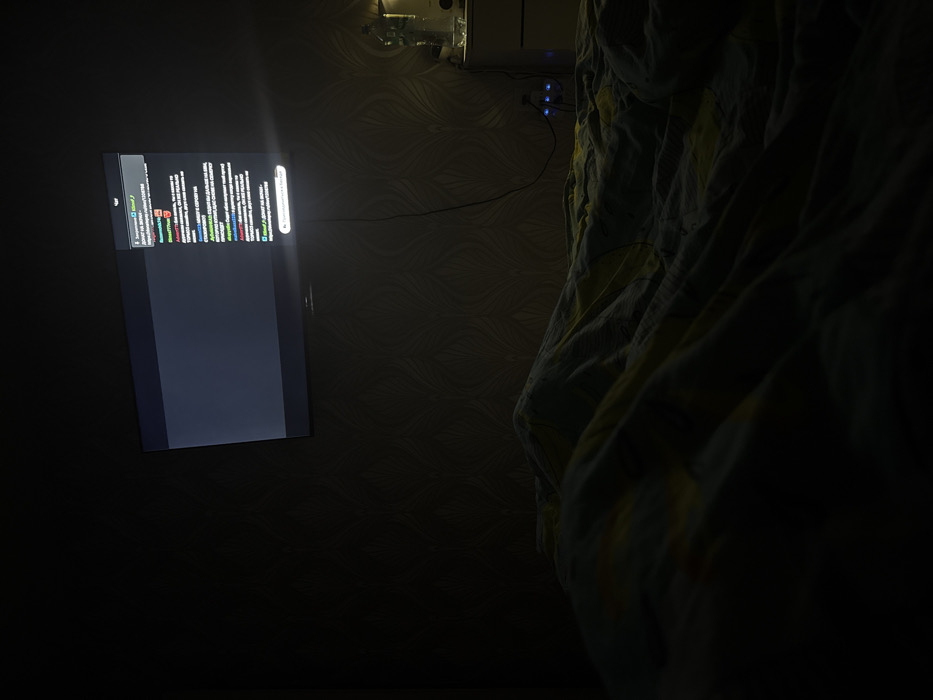 A dimly lit room features a television mounted on the wall, displaying text in a foreign language. The wall behind the TV has a textured pattern. To the right of the screen is a bed covered with a patterned duvet, mostly obscured in shadow. An electrical outlet with illuminated blue indicator lights is visible near the top of the image, between the TV and the bed. The room appears to be a bedroom, and the image is oriented sideways.