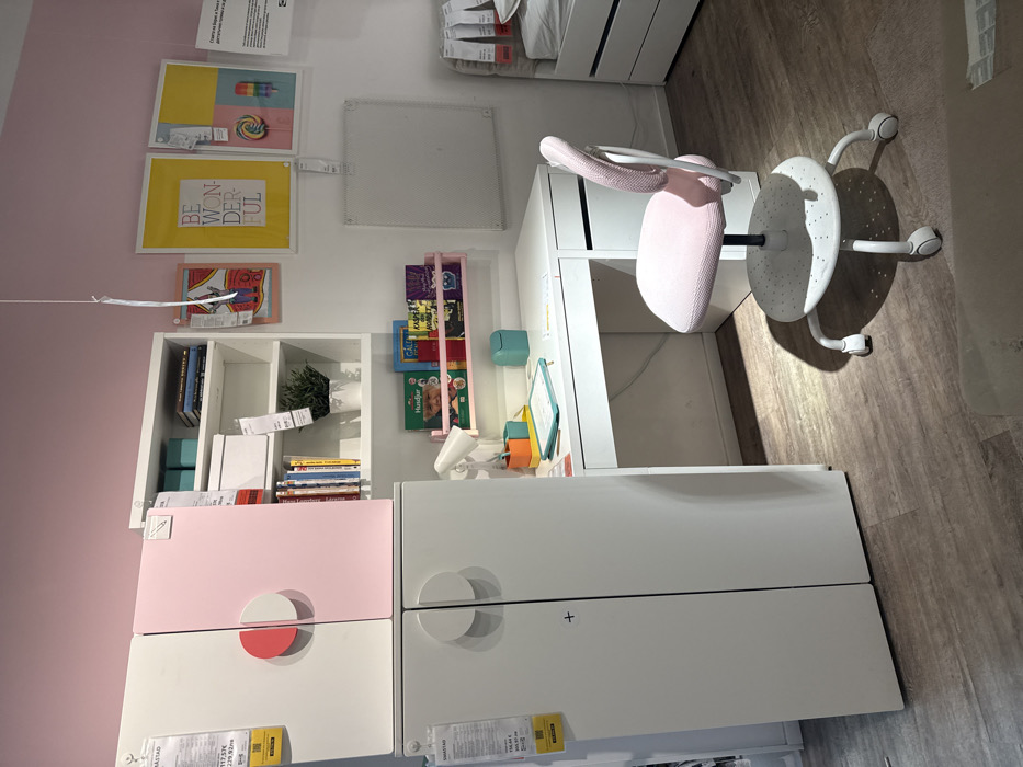 This image depicts a static interior display, likely a retail showroom section, located in the city of Unknown, Unknown. The room's upper wall is painted light pink, transitioning to white on the lower section, complemented by a light-toned wood-look laminate floor. On the left, a white modular storage unit with four doors stands. The top-right door panel is light pink, and all visible doors feature large circular white or pink-and-white handles. Product tags are attached to the left side of this unit. Adjacent to the storage unit, a white rectangular desk with an integrated drawer unit is positioned. A white task lamp, a multi-compartment pen holder with orange and blue sections, and a small teal cylindrical bin are on the desk surface, alongside an open book or tablet. Above the desk, a white wall-mounted open shelving unit displays books, white decorative boxes, and a small potted artificial plant. Below this, a narrow pink wall-mounted shelf holds several children's books. A pink fabric-upholstered task chair with a white five-wheel base is positioned in front of the desk. The white wall above the desk features three framed items: a multicolored abstract print on the left, a yellow poster with "BE WONDERFUL" in white text in the center, and a poster depicting a red lollipop and a multi-colored popsicle on the right. Additional product information tags are affixed to the wall near these items. A white bed frame with visible mattress and linens, also bearing product tags, is partially visible on the far right. No people or animals are present in the image.