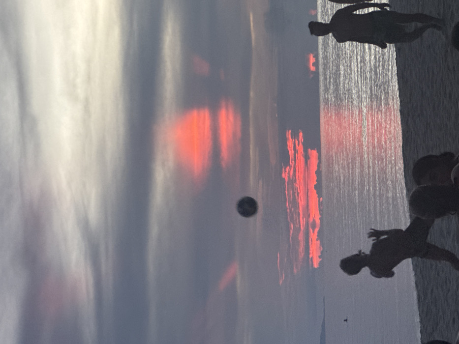 This image depicts a beach scene at sunset in Baan Sri Thanu, Thailand. The sky is characterized by an overcast layer of dark grey and lighter grey clouds, through which the setting sun projects intense red and orange light, particularly forming horizontal bands and a prominent vertical shaft of color in the central and upper-central areas. The calm ocean surface below reflects these sunset colors, creating a shimmering red-orange path extending from the horizon towards the viewer. On the sandy beach in the foreground, several individuals are present, rendered as dark silhouettes against the bright sky and reflective water. In the mid-left, a person is captured in mid-action, positioned to kick or strike a dark, spherical ball that is suspended in the air above their head. Their body is angled to the right, with arms and legs bent. To the right, another person stands near the water's edge, facing left, observing the activity. Partial silhouettes of at least two additional individuals are visible at the very bottom edge of the frame, indicating a small gathering. A faint landmass is discernible on the distant left horizon.