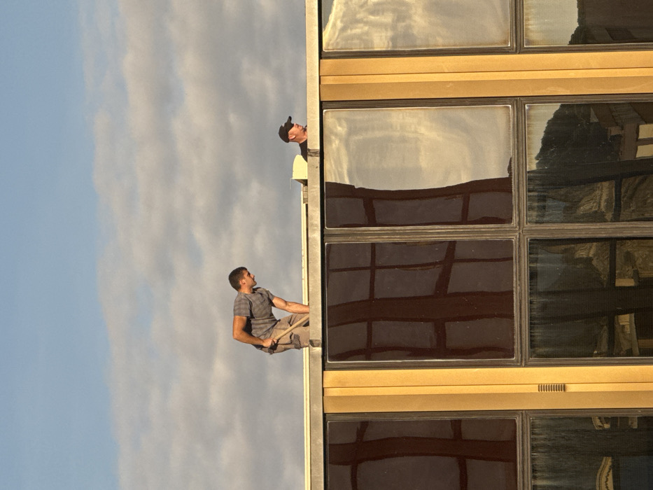Two males are present on the rooftop of a building in the city of Monaco, Monaco. The individual on the left, a young adult male, wears a grey short-sleeved collared shirt and light-colored shorts or trousers. He is bent forward at the waist, actively holding a tool with a visible wooden handle that extends downwards out of the frame. The individual on the right, an adult male, wears a dark t-shirt and a dark baseball cap; only his head and upper torso are visible above the rooftop edge, and he appears to be looking towards the right. Below the rooftop, the building facade comprises multiple stories of large, rectangular, multi-pane windows. These windows are highly reflective, displaying distorted reflections of interior structures, adjacent buildings, and the sky. Vertical golden-yellow structural elements frame sections of the window facade. The environment features a bright, partially cloudy sky with a mix of blue and white-grey clouds above the building.
