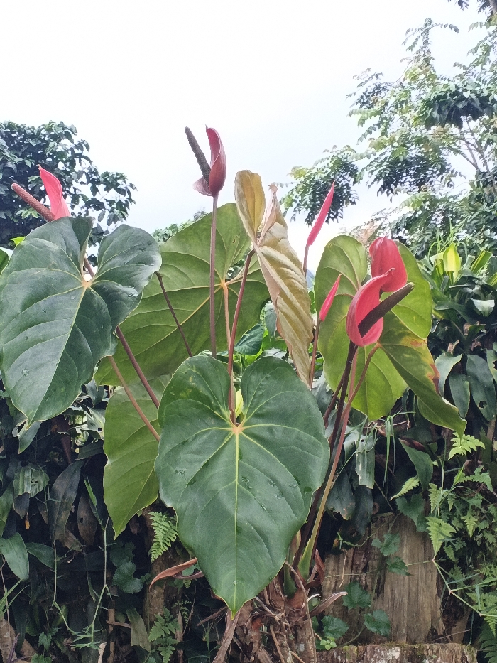 This image depicts a botanical scene within the city of Lokossa, Benin. The central focus is a cluster of Anthurium plants, exhibiting multiple large, heart-shaped, dark green leaves with visible venation. Some leaves show lighter green or yellowish hues, consistent with new growth. Several distinct Anthurium inflorescences are present: one on the far left with a bright red spathe and dark spadix, another near the top center with a reddish-brown spathe and dark spadix, and multiple others on the right featuring bright to light red spathes and dark spadices. The plants' stems are reddish-brown. The upper background shows a bright, overcast sky. The mid-ground and lower portions of the scene are filled with dense, varied green foliage, including tree leaves and smaller fern-like plants. Wooden elements, possibly tree stumps or branches, are visible at the base of the primary plants.