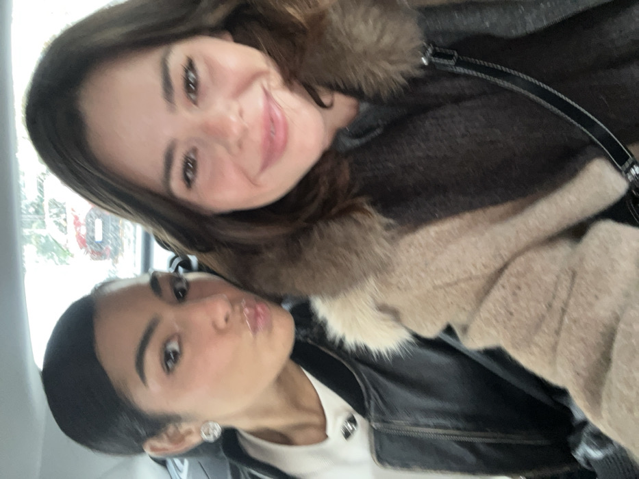 The image captures two adult females seated inside a vehicle, specifically in the city of Nanterre, France. The individual on the left has dark hair pulled back, an olive complexion, and is wearing a white top under a black bomber jacket. A silver-toned stud earring is visible on her left ear. Her lips are pursed, covered in gloss, and she gazes towards the camera. The individual on the right has brown, wavy hair and a fair complexion. She is wearing a light beige coat with a prominent brown and lighter-toned fur collar over a darker garment, with a black strap from an object crossing her right shoulder. She is smiling and also looking towards the camera. The background, visible through the vehicle's rear window, is blurred, showing a street scene with a red vehicle and indistinct greenery under an overcast sky.