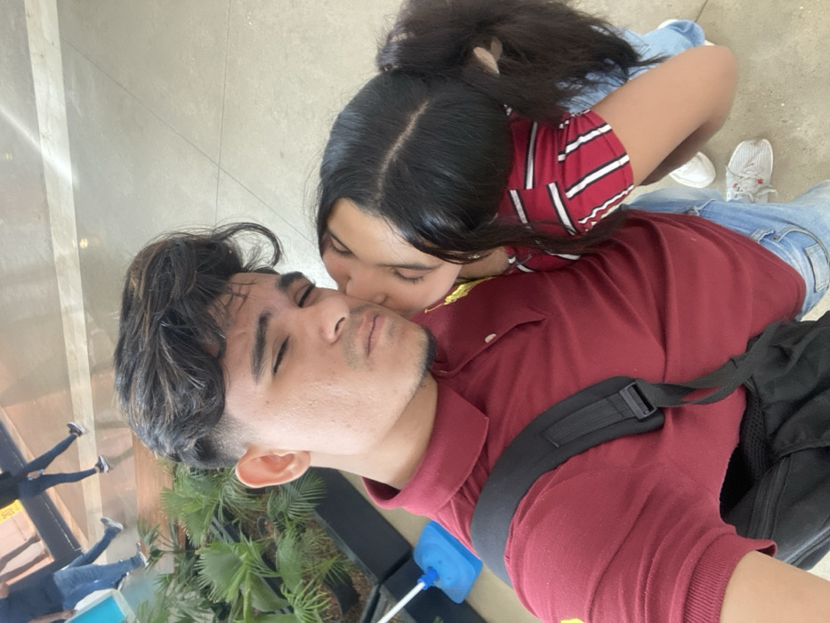 A young couple poses closely for a selfie. The woman kisses the man's cheek. He has dark hair and is wearing a dark red polo shirt with a black strap. The woman has long dark hair pulled back in a ponytail, a striped maroon and white shirt, and light blue jeans. Their legs and shoes are visible in the background, suggesting they are on the floor. A potted plant and a partial reflection of people are in the bottom left corner.