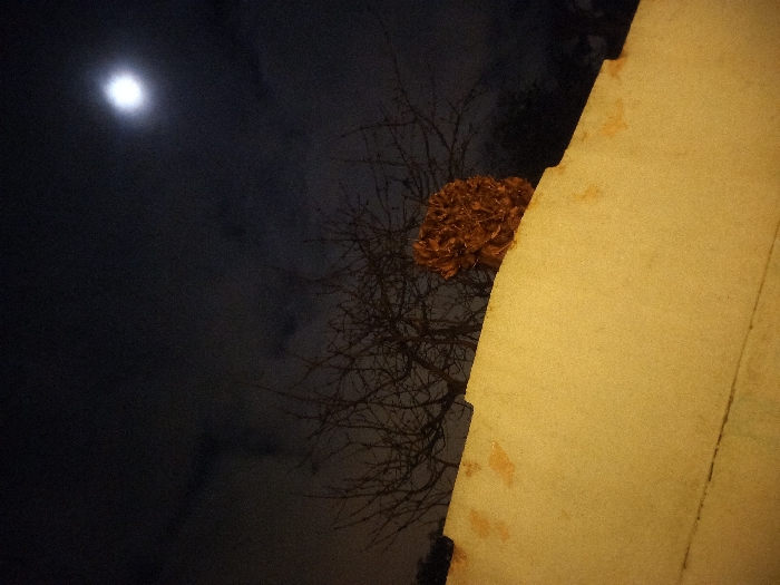 A low-angle shot features a full moon illuminating a dark night sky. Silhouetted bare tree branches reach towards the moon, a cluster of brown leaves clinging to one branch. To the right, a light-colored wall angles into the frame, its surface marred with a few orange stains. The composition creates a contrast between the natural elements of the night and the constructed wall.