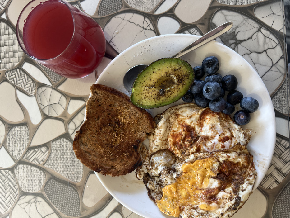 An overhead photograph displays a prepared meal set on a patterned table surface in the city of Brestovitsa, Bulgaria. A white, oval-shaped plate occupies the central and lower-left portion of the frame, holding several food items. On the plate are two fried eggs, one exhibiting a more distinct orange yolk, the other a uniform cooked appearance. Above the eggs, a single slice of dark toasted bread is positioned, appearing seasoned. To the right of the eggs, a pitted half-avocado, containing a small pool of liquid and black speckles, is present. A cluster of fresh blueberries rests next to the avocado. A silver spoon is partially visible, resting on the plate between the avocado and the blueberries. In the upper-right quadrant of the image, a clear glass, approximately three-quarters full of a translucent reddish-pink liquid, stands directly on the table. The table surface features an abstract, mosaic-like pattern composed of irregular shapes in varying shades of beige, grey, and dark brown, some areas textured with a woven design, others resembling cracked or marbled stone. No individuals are visible.