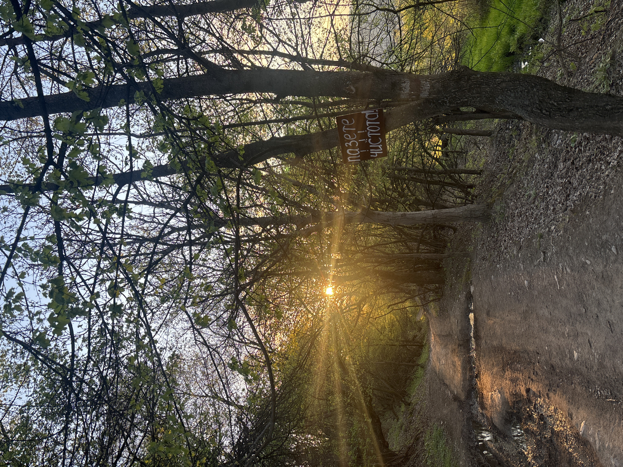 The image captures a dirt path winding through a forest in Izvor, Bulgaria. Sunlight streams through the trees, creating beams of light. A sign, written in Cyrillic, is affixed to a tree trunk, likely conveying a message about cleanliness. The path appears to be somewhat muddy. The scene depicts a natural environment.