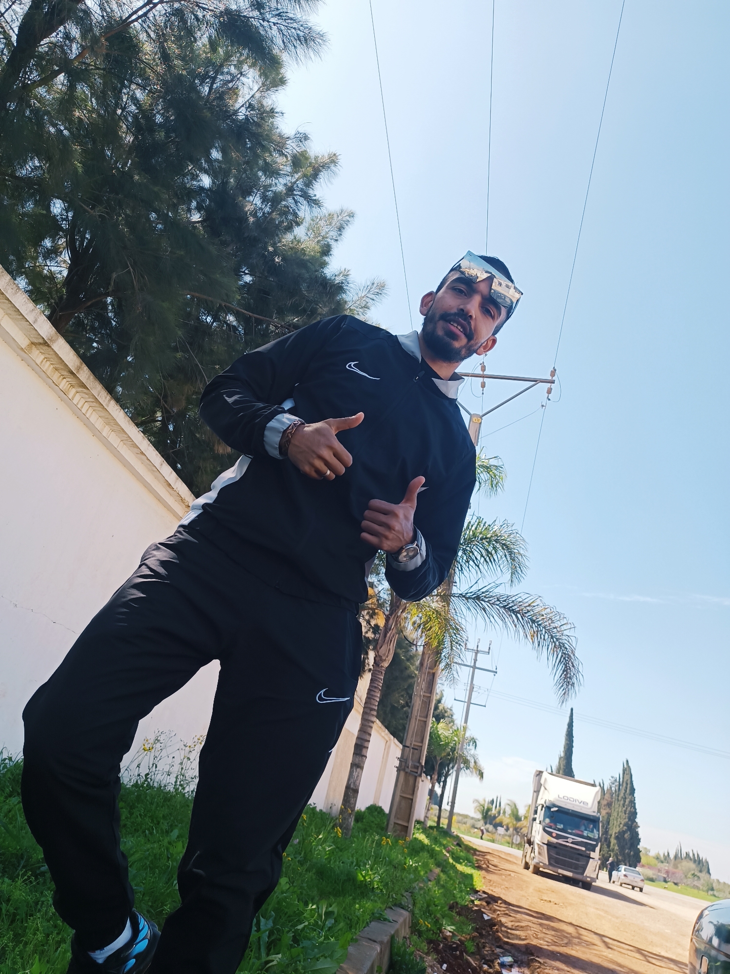 The scene is set on an unpaved roadside or rural track in the city of Unknown, Unknown, under a clear, bright blue sky. An adult male, with dark hair and a beard, is captured from a low angle, standing in the foreground. He wears a black tracksuit with a white Nike swoosh logo on the jacket chest and left pant leg; the jacket features light grey accents on the sleeves. Mirrored sunglasses rest on his forehead. A silver-toned watch is visible on his left wrist, and a brown beaded bracelet along with a ring are on his right hand. He poses with both thumbs extended upwards, his mouth slightly open, looking towards the camera. To the subject's left, a white rendered perimeter wall is visible, backed by dense evergreen trees. To his right and extending into the background, utility poles with power lines are present, alongside a palm tree. The immediate foreground consists of green grass and a concrete curb. In the background, an unpaved road curves to the right, featuring a white semi-truck with "LODIVE" printed on its cab, and a white sedan further down the road. Another individual is visible near the white sedan. The distant landscape includes rows of tall, slender evergreen trees and undulating terrain. The scene is illuminated by direct sunlight, suggesting midday conditions.