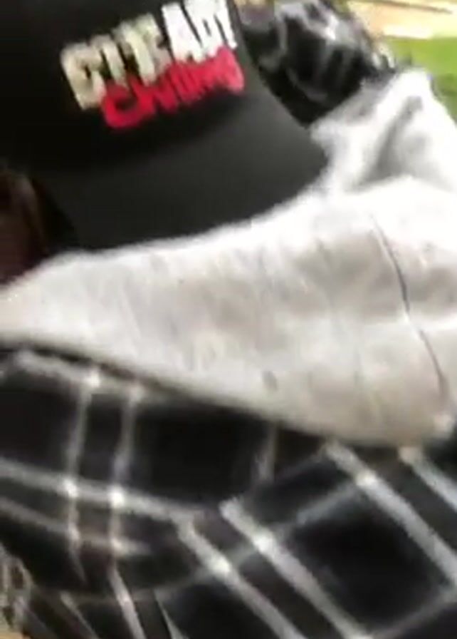 A person wearing a black and white plaid shirt and a black baseball cap that says “Steady Chilling” is holding a video camera and filming a man and a woman standing together