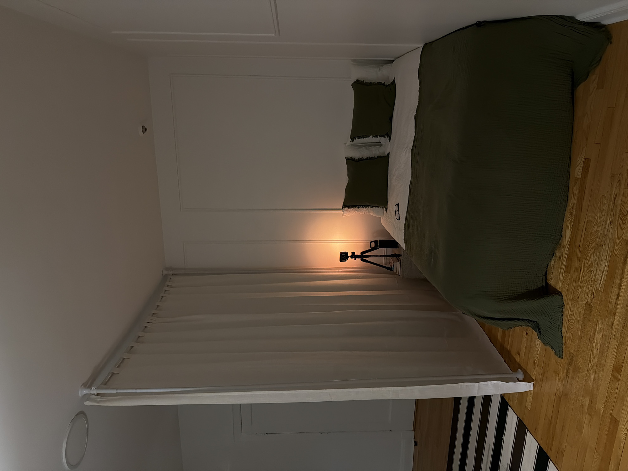 The image depicts a bedroom interior. The bed is made with an olive-green coverlet and white linens, with two dark green pillows. A camera is placed on a tripod on a nightstand beside the bed. The room is partially separated by a white curtain. The flooring appears to be hardwood. The absence of specific location markers prevents the determination of the exact address in Montreal, Canada.