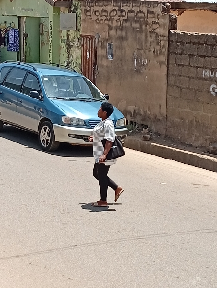 An outdoor scene in Jos, Nigeria, depicts a woman walking on a paved road under bright sunlight