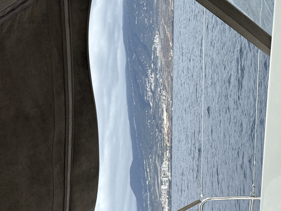 A landscape view through a window or opening, showing a body of water with a mountainous coastline. The coastline is populated with buildings and vegetation. The sky is overcast, and a gray or beige curtain partially obstructs the view on the left. Silver metal support structures and railings are visible on the right side of the window frame, with vertical lines running down into the water.
