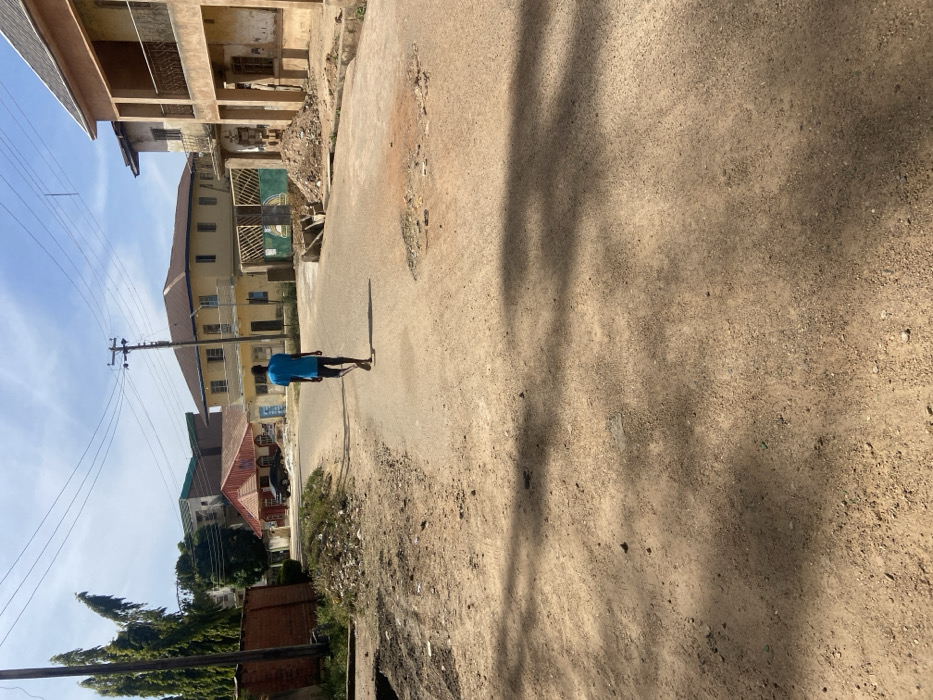 The image depicts a street scene in Jos, Nigeria, under a bright, partly cloudy sky. The foreground consists of an unpaved, reddish-brown dirt path transitioning into a worn, dark asphalt road. Multiple shadows extend across the dirt from an unseen source to the left. A single individual, a young adult male, walks away from the camera, barefoot, down the center of the asphalt road. He wears a short-sleeved blue t-shirt and dark shorts. His shadow is cast to his left. The road exhibits several potholes and patches where the asphalt has eroded, revealing the underlying dirt. To the immediate left, a dirt shoulder parallels the road, featuring sparse vegetation and a low, red brick wall. Behind this wall, tall, narrow evergreen trees are visible, followed by a building with a reddish-brown tiled roof and a dark sedan parked in front. Further buildings are partially visible in the distance. To the right, a two-story building with a light beige facade and a brown roof stands adjacent to the road. It features multiple windows and balconies with dark metal railings. Next to it, an older, two-story structure with a faded, light brown facade and dark window openings is visible. In front of the beige building, a green metal gate with a geometric pattern is present, and a pile of loose soil and construction debris is situated on the unpaved roadside. Overhead utility lines are strung across the scene, supported by a wooden utility pole visible behind the walking individual. No interactions between individuals are observed.