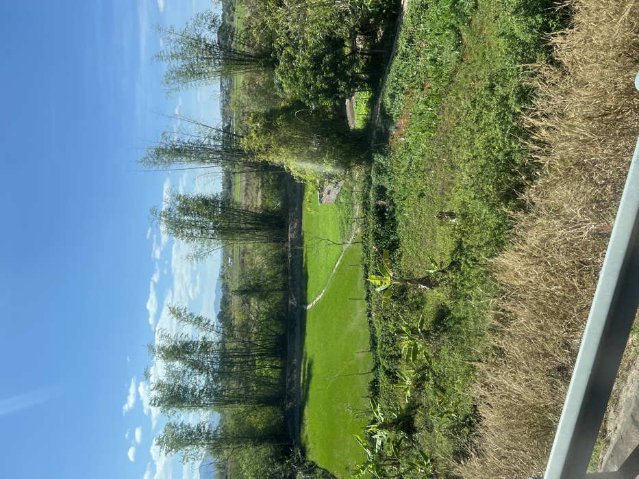 A vertical landscape shows a vibrant green field bordered by bamboo trees and lush vegetation. Beyond the trees, a vast expanse of fields stretches into the distance. The sky is a clear blue with scattered white clouds. The edge of a structure, possibly a balcony, is visible in the foreground. A patch of tall, dry grass sits adjacent to the green growth.