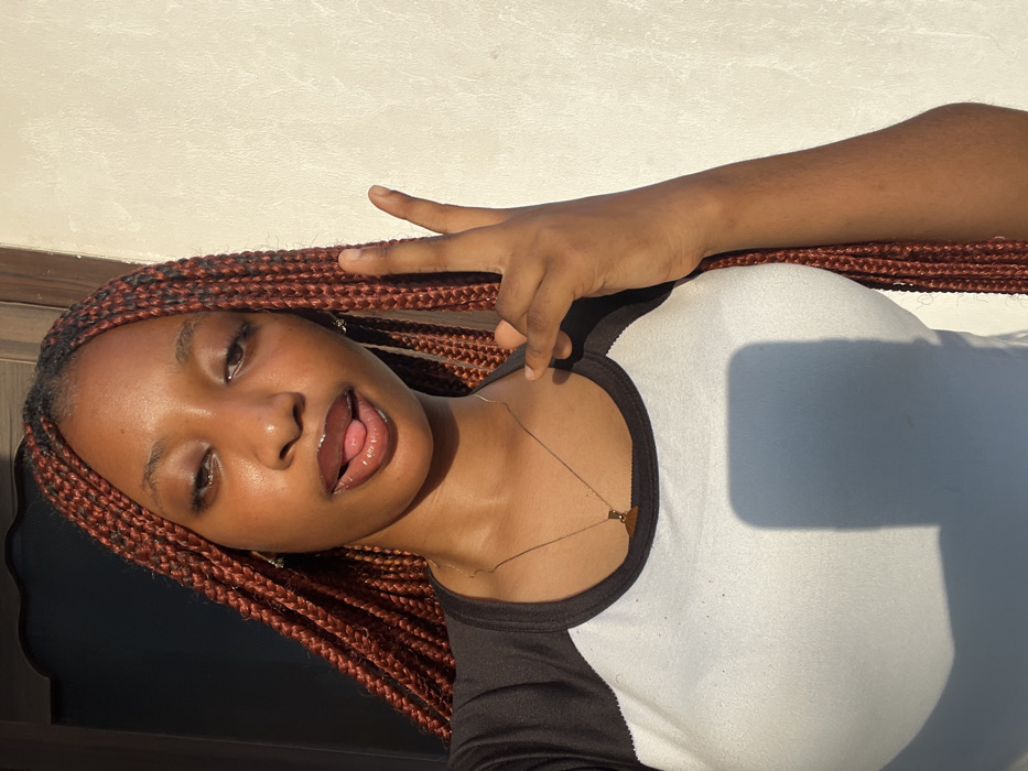 A young individual with dark skin and reddish-brown box braids is depicted in a close-up, outdoor portrait taken in Lagos, Nigeria