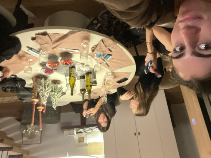 A group of people gather around a round table set for a meal. Place settings feature beige cloths, silverware, glasses, and bowls filled with red items. Wine bottles are centrally located. Decorative greenery and candlesticks stand on a dark grey pot. The scene is a casual indoor setting, capturing a moment of connection among friends or family. A woman's face appears in the upper right corner, suggesting she is taking the photo.