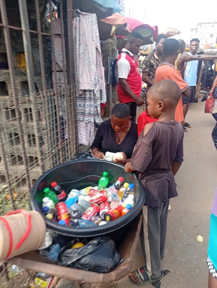 The image depicts an active street market scene in Onitsha, Nigeria. In the foreground, a large black plastic basin, likely a modified wheelbarrow tub, contains numerous bottled and canned beverages, predominantly soft drinks and water, some appearing to be chilled. This basin rests on a rustic wooden cart, beneath which a black plastic bag and a yellow object are visible. To the immediate left, a woven straw basket with a red handle sits on the ground. A woman, wearing a black top, is seated directly behind the beverage basin. Her head is bowed as she meticulously examines or counts money or small items wrapped in white material held in her hands. To her right, a young boy, approximately 5-8 years old, stands with his back partially to the camera, observing the basin or the woman. He wears a dark brown t-shirt with visible tears on the shoulders, grey sweatpants with white side stripes, and black "Champion" branded slide sandals. In the midground, several male figures populate the bustling market. One man, wearing a red and white short-sleeved shirt, stands behind the seated woman. Other individuals, dressed in various casual attire including patterned shirts and an orange t-shirt, are distributed throughout the background. Overhead, sections of light blue and red tarpaulin or awnings provide shade for market stalls. Clothing items are visibly displayed for sale behind the primary vendors. The ground consists of rough pavement or packed earth. Distant background elements include simple concrete block buildings under daylight conditions.