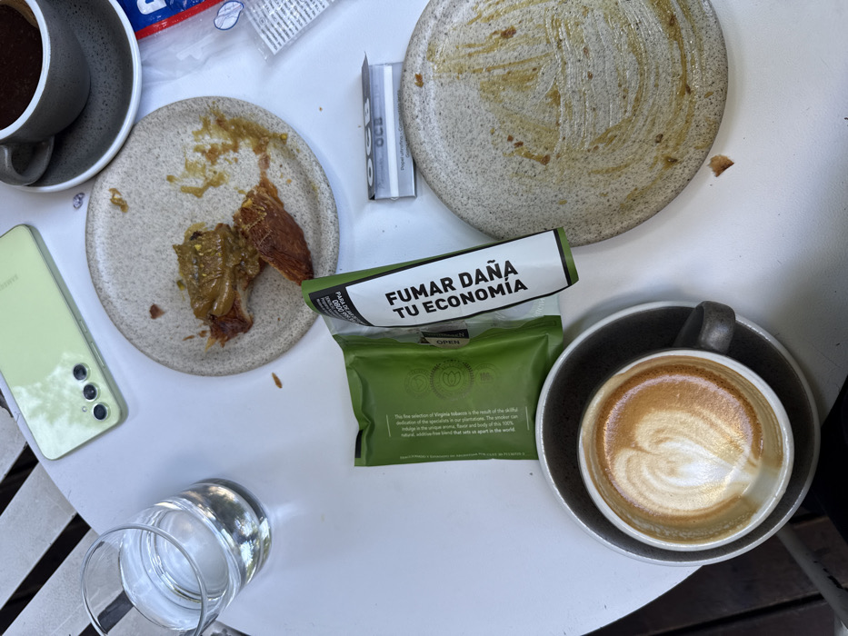 The scene depicts an overhead view of a white slatted outdoor table at a cafe or restaurant in Buenos Aires, Argentina. On the table, a light green Samsung smartphone rests face down. A clear glass of water, partially consumed, is positioned to the left. Two round, textured ceramic plates, both soiled with food residue, occupy the center and lower right. The upper plate contains remnants of a pastry with a green-brown filling. A dark grey ceramic cup on a matching saucer holds a partially consumed dark coffee. Adjacent to the upper plate, a green tobacco pouch with an open flap displays the Spanish warning "FUMAR DAÑA TU ECONOMÍA" (Smoking Harms Your Economy). A booklet of OCB rolling papers is visible next to the lower plate. Below the tobacco pouch, another dark grey ceramic cup on a saucer contains a cappuccino or latte with a heart design in its foam. The arrangement suggests a recently concluded or ongoing meal for one or two individuals.