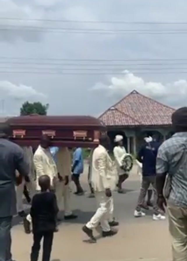 A group of men in white suits carries a casket through a street, accompanied by a small child in black and surrounded by a crowd of onlookers. The setting appears to be outdoors, possibly in a residential or village area, with houses and trees visible in the background.