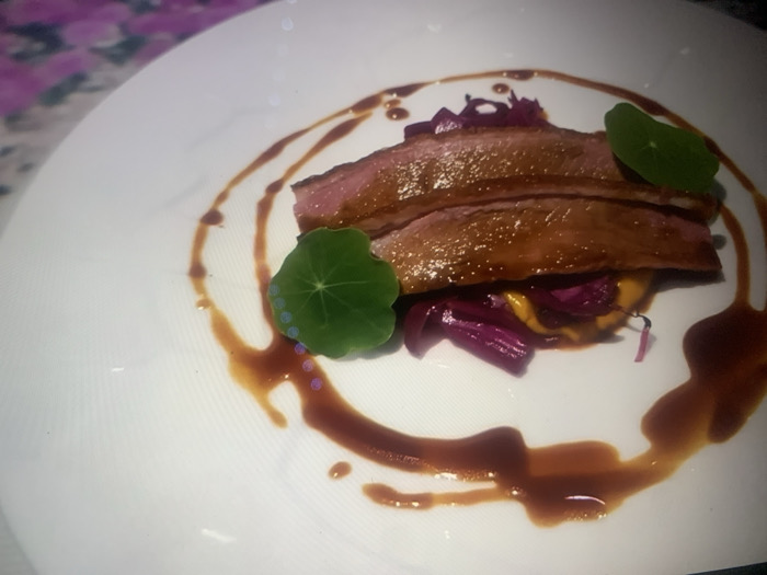 A culinary dish is presented on a round, white plate, positioned slightly off-center towards the right. The dish features two elongated slices of seared meat, exhibiting a golden-brown exterior and a lighter pink interior. These slices rest upon a base of yellow-orange purée, which is partially obscured by vibrant purple-red shredded vegetables, consistent with braised red cabbage. Two small, round green leaves, possibly nasturtium, garnish the plate; one is placed to the upper left of the meat slices, and the other to their right. A dark brown, glossy sauce is artfully drizzled in a wavy pattern across the plate, encircling and underlying the food components. The background is out of focus, displaying blurry purple and pink hues, suggesting ambient lighting or decorative elements behind the subject. The image does not contain identifiable features to determine its specific location within the city of Donetsk, Ukraine. No individuals or actions are depicted beyond the static arrangement of the meal.
