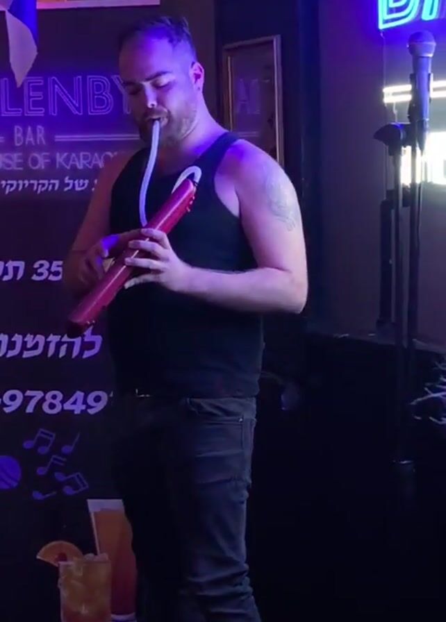 man playing a melodica at what appears to be a karaoke bar. The man is standing in front of a backdrop featuring the name of the bar, "ALLENBY," and related details written in Hebrew. He is wearing a black tank top and jeans. The melodica is red and white. Behind the man is a neon sign that reads "BAR." The environment is dimly lit with blue and purple lights. The man is playing the melodica with both hands, looking focused on the instrument.