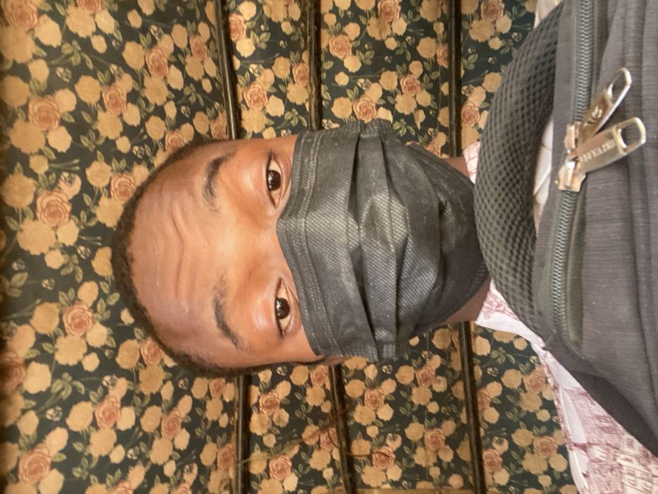 A person wearing a black face mask is looking at the camera with a backpack strapped on their right shoulder. The background is a busy floral pattern in shades of brown, tan, and green. The person's skin tone is brown, and their eyes are visible above the mask. The photo seems to be taken indoors. The backpack is black and partially obscures the person's body.