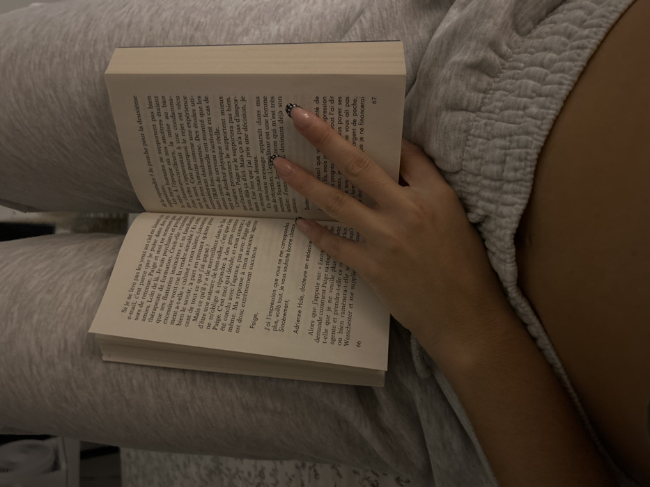 An overhead perspective captures the lower torso and upper legs of an individual reclining in an indoor setting in Chambœuf, France. The primary subject is an open paperback book, displaying French text on pages 66 (left) and 67 (right). A hand, featuring clear and black polka-dotted manicured nails, rests on the lower portion of the right page, indicating active reading or a paused state. The individual is attired in light grey, ribbed or textured lounge pants. A light grey, quilted blanket or cover is visible across the lower abdomen and foreground. The environment appears to be an interior space with ambient, likely subdued, lighting.