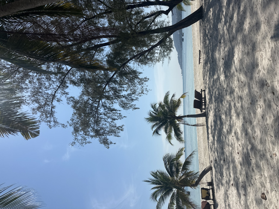 A serene beach scene unfolds with the shoreline running vertically. Two palm trees stand tall, casting shadows on the white sand. Two pairs of beach chairs are strategically placed near the trees. A larger, deciduous tree is seen above with delicate branches. The sky is a clear blue, and the ocean provides a tranquil backdrop. The overall mood is peaceful and inviting.