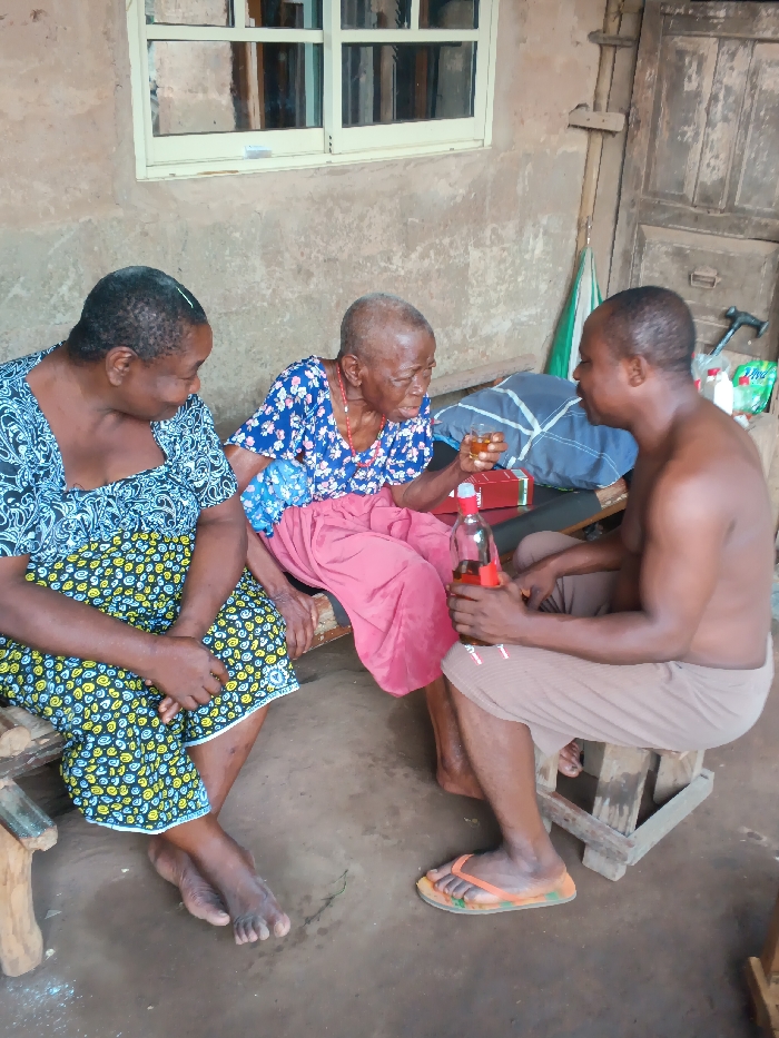 This image depicts a social gathering of three individuals in what appears to be a residential outdoor or semi-outdoor setting within Eziudo, Nigeria. The background features a distressed, light brown concrete wall with a cream-colored window frame visible in the upper left and a weathered, dark wooden door on the right. The ground is an earthen or concrete surface. From left to right, the scene includes: 1. An adult female, positioned left of center, seated barefoot on a wooden bench. She wears a black and white patterned top and a long skirt with yellow, black, and white circular patterns. Her hair is styled short. She is looking towards the center individual. 2. An elderly female, positioned centrally, also seated on the wooden bench. Her head is mostly bald or has very short, sparse hair, and she wears a blue top with a white and orange floral pattern, along with a red beaded necklace and a solid pink or red skirt. She holds a clear glass containing an amber liquid in her right hand and is looking towards the man on the right. A red box, possibly packaging, is situated on the bench next to her right hip. 3. An adult male, positioned right of center, seated on a wooden stool. He is shirtless and wears light brown trousers and orange and yellow flip-flops. He holds a clear glass bottle containing an amber liquid in his left hand, its label indistinct, and is looking towards the elderly woman. The three individuals appear to be engaged in a conversation, possibly sharing alcoholic beverages. A grey and white striped pillow or cushion rests on the bench behind the elderly woman. To the right, near the wooden door, a green and white striped object (possibly an umbrella) leans against the wall, and several small plastic bottles or containers are visible on the ground.