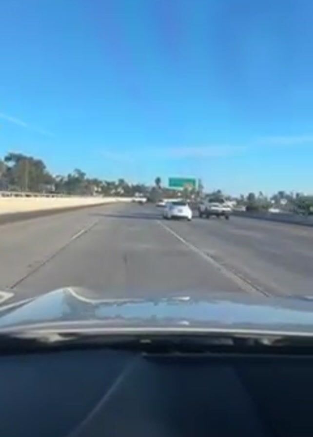 view from inside a car driving on a freeway under a clear blue sky. The camera is focused on the road ahead, capturing the dashboard and the highway. A sign indicates the upcoming exits for Sassafras Street and San Diego Airport. There are a few other vehicles on the road, including a white sedan and a light-colored pickup truck. Palm trees and other greenery are visible in the distance along the side of the road.