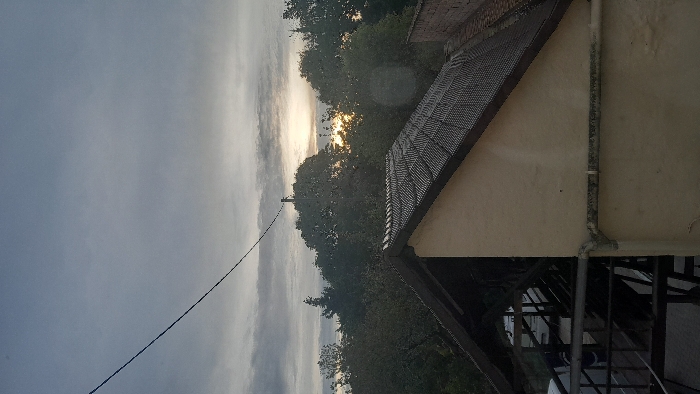 This image displays an elevated view of an urban environment in Strasbourg, France, under an overcast sky. The upper section of the frame is dominated by a gray, cloudy sky, with a diffuse yellowish-white light source in the upper right, indicating an obscured sun. A dark utility cable runs diagonally from the top-left corner, extending towards a utility pole positioned above the treeline, slightly left of the image's vertical center. The midground is occupied by a dense, dark green canopy of deciduous trees. Through this foliage, the glow of the obscured sun is visible on the right. Below the treeline, a portion of a building occupies the foreground. This includes a pale yellow or beige exterior wall in the lower right, surmounted by a dark, textured tiled roof with a noticeable slope. A weathered dark gutter or pipe is affixed horizontally along the upper part of the wall. To the left of this building, an outdoor structure featuring dark metal railings and support beams is partially visible, largely obscured by shadows. Faint outlines of parked vehicles are discernible beneath this structure. No individuals or explicit actions are present within the scene.