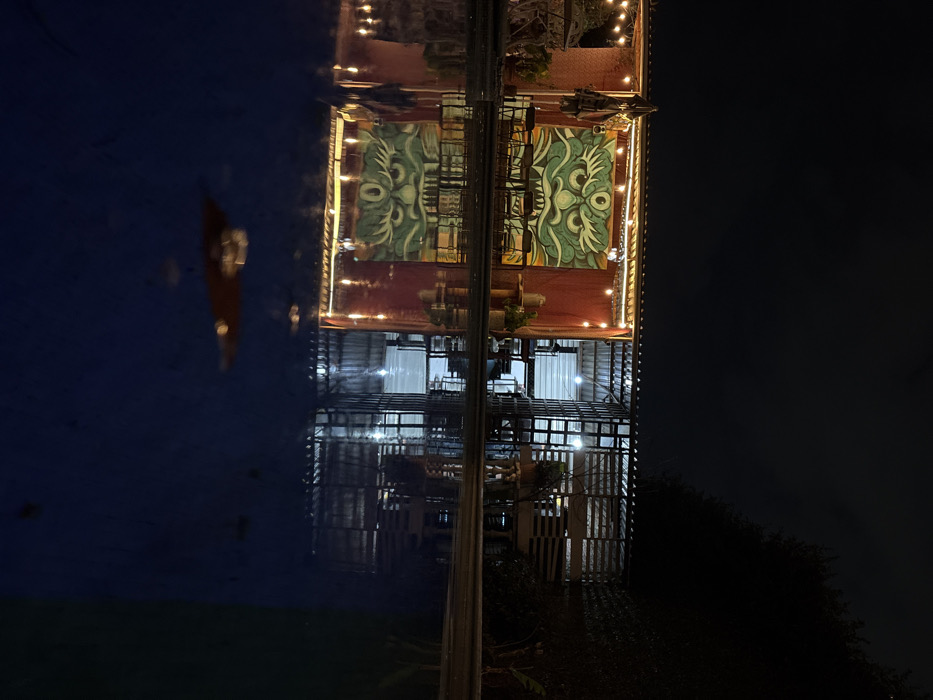 This nighttime image captures an outdoor scene in Cuernavaca, Mexico, centered on a building complex partially reflected in a dark body of water, likely a swimming pool. The primary structure on the left features a reddish-brown wall adorned with a large, stylized green mural depicting a monstrous, three-eyed face with sharp teeth. A string of warm-toned lights is suspended above the mural. In front of this wall, several dark tables and chairs are arranged, accompanied by an open umbrella, potted plants, and a light-colored ceramic jug. To the right, an adjacent multi-level structure is visible, characterized by an open framework of horizontal and vertical slats, possibly metal or wood, and a corrugated metal roof. Its interior is brightly illuminated, revealing internal structural elements. A potted plant stands on a platform near this structure. Beyond the buildings on the far right, dense, dark foliage is silhouetted against the dark night sky, which shows minimal cloud cover. The lower half of the image is dominated by the dark, reflective water surface, which clearly mirrors the illuminated building elements, including the mural, string lights, and the interior light of the adjacent structure. The water surface exhibits minor ripples and contains a few discernible floating leaves. No individuals, direct actions, or interactions are visible within the scene.