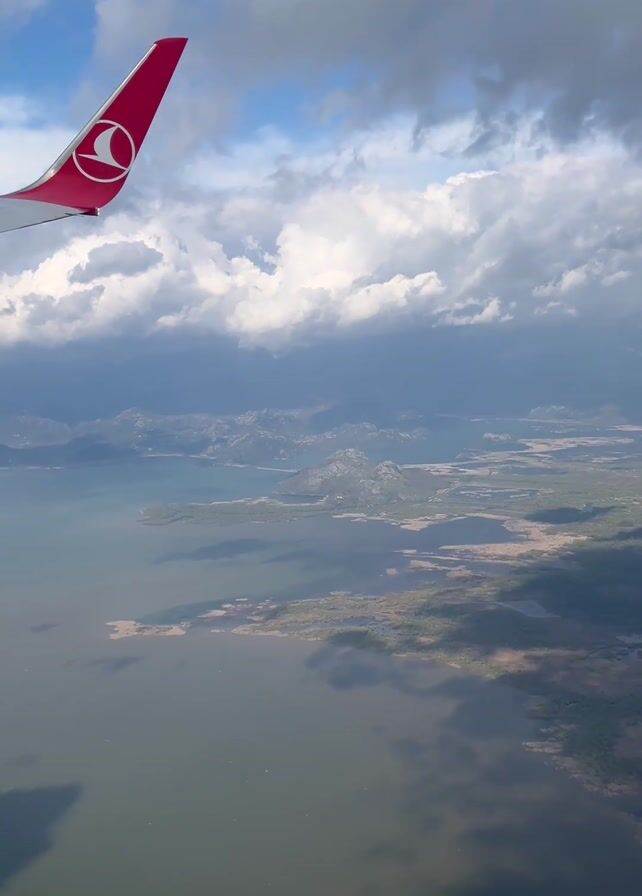 view from an airplane window. The wing of a Turkish Airlines plane, with its distinctive red and white logo, is visible in the top left corner of the frame. Below the wing, the camera captures an expansive landscape featuring a large body of water with islands and land formations scattered throughout. In the background, there are hills or low mountains. The sky is partly cloudy with patches of blue, and the lighting creates shadows over the landscape.