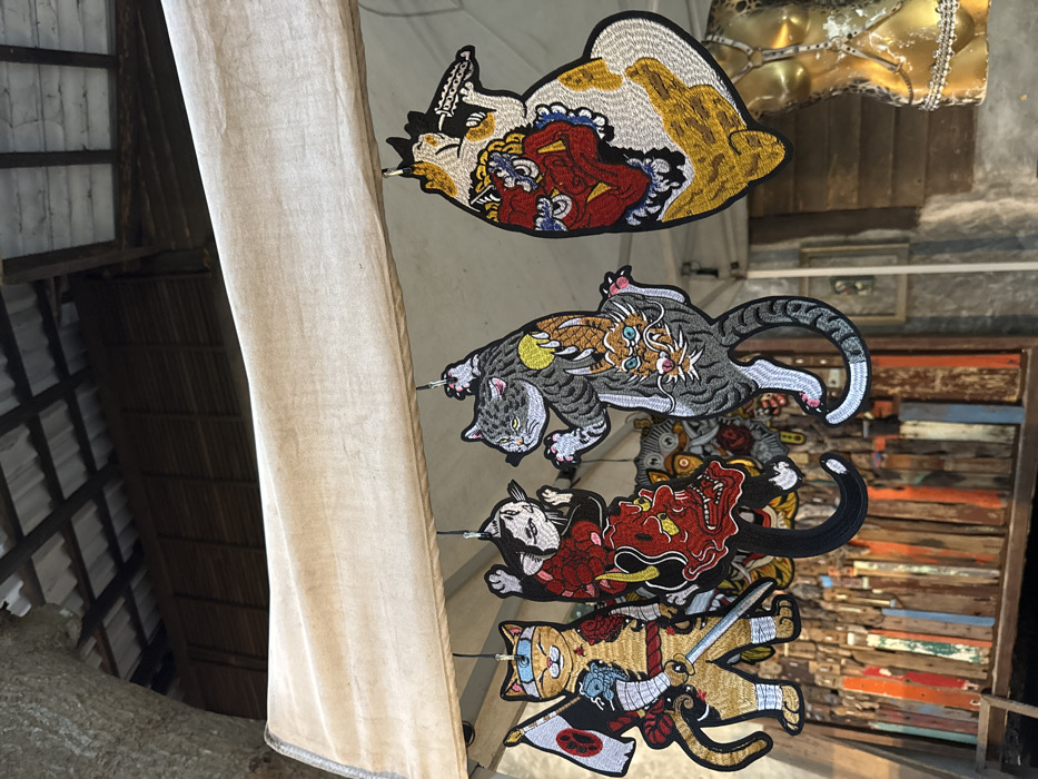 Four embroidered fabric patches, depicting anthropomorphic cats in Japanese-inspired motifs, hang suspended from a light-beige fabric canopy