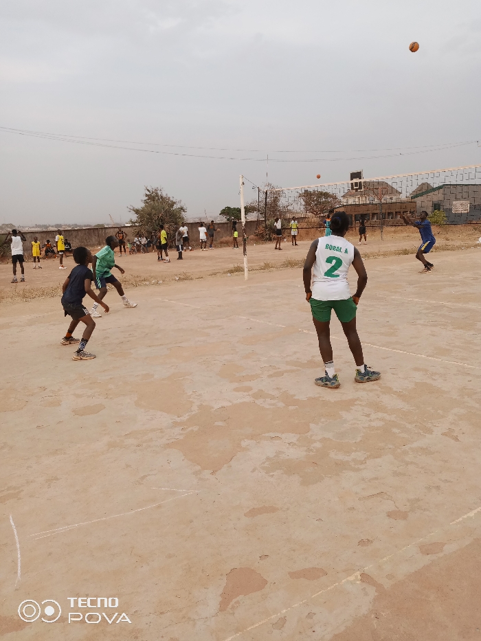 An outdoor volleyball game unfolds under a cloudy sky