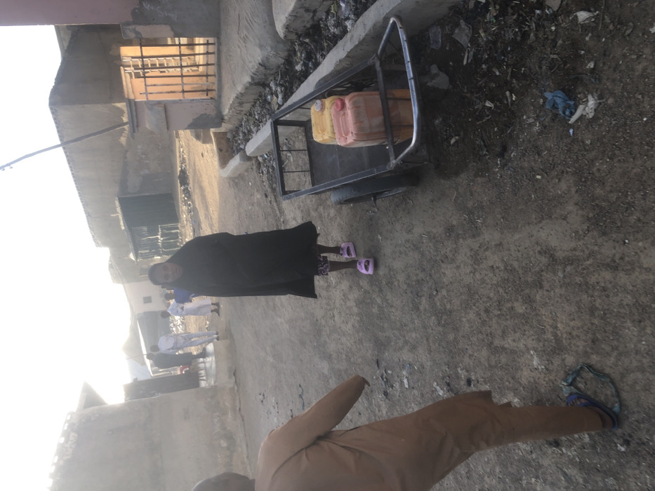 The image displays an outdoor scene in Dutsinma B, Nigeria, on an unpaved, dusty thoroughfare under bright, ambient sunlight. In the foreground left, a person is partially visible from the back, wearing a light brown, long-sleeved garment and blue sandals. In the mid-ground, a female subject walks towards the viewer, clad in a black head covering and a black outer garment over patterned trousers, with pink slide sandals. To her right, a black two-wheeled metal cart holds two yellow-orange plastic jerrycans. This cart is situated adjacent to a concrete curb that borders an open gutter containing dark debris and litter. In the background, multiple individuals, including one prominent figure in white traditional attire, stand near various low-rise buildings. These structures feature unadorned walls of what appears to be rough concrete or mud, and one building on the right includes a metal security gate. A thin vertical utility pole is visible against the sky.
