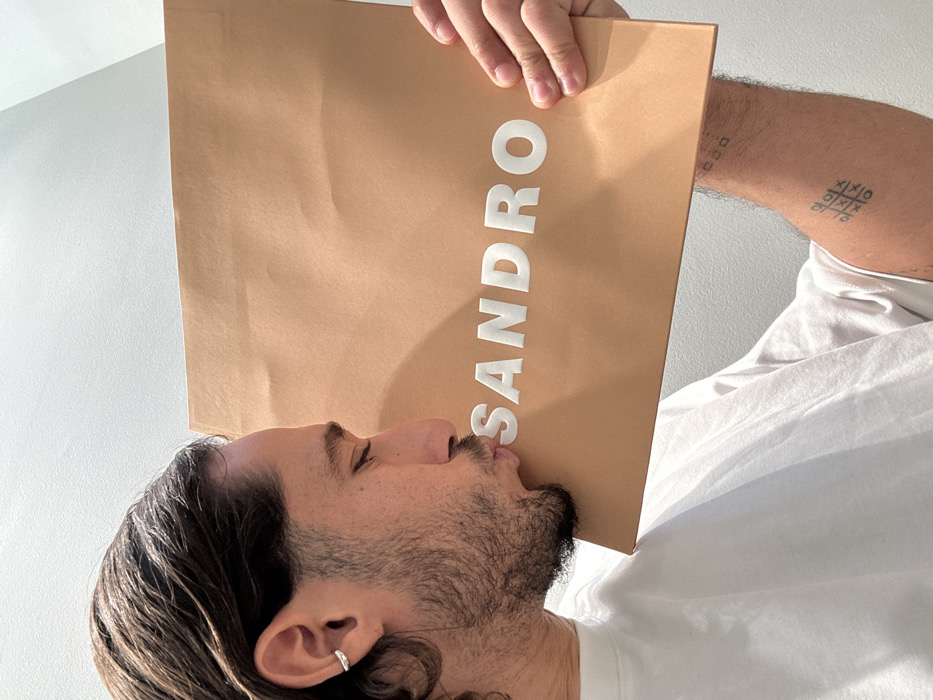 A male individual is shown in profile, from the chest up, against a plain, light-colored wall. He has dark, medium-length hair and a trimmed beard. He wears a white t-shirt and a silver-colored ear cuff on his left ear. His lips are pursed, pressing against the prominent white "SANDRO" logo on a light brown paper bag he holds with his right hand. A tattoo of a tic-tac-toe grid with an "X" winning diagonally is visible on his right upper arm. The scene is located in Paris, France, inferring from the brand "Sandro," which is a French fashion house based in Paris.