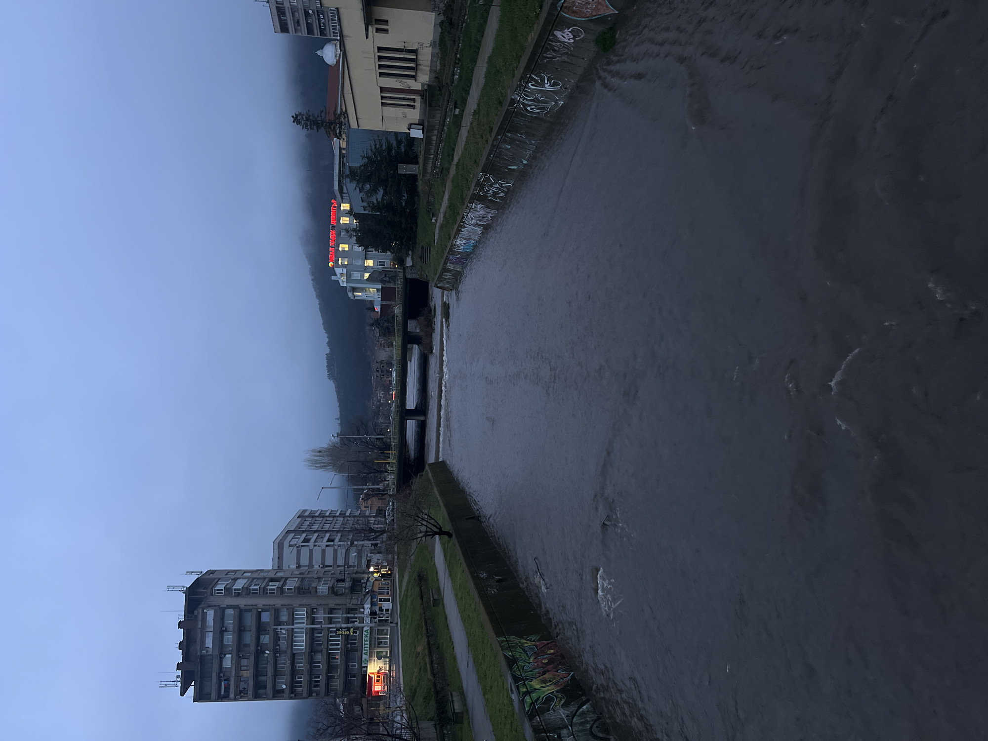The image depicts a section of a river flowing through the city of Sliven, Bulgaria, at dusk or dawn under an overcast, hazy sky. The overall lighting is dim, necessitating artificial illumination from buildings and streetlights. Mountains in the distant background are partially obscured by fog or low-hanging clouds. The river, approximately 15-20 meters wide, runs from the background towards the foreground. Its water is murky, dark grey, and exhibits visible ripples and small rapids, suggesting current flow. Both banks are contained by concrete retaining walls, approximately 2-3 meters high. On the left (west) bank, the concrete wall in the foreground is extensively covered with colorful graffiti. Above this wall, a narrow strip of green grass borders a paved pedestrian pathway. A leafless deciduous tree stands next to the path. Further back, a prominent multi-story residential or commercial building, approximately 12 stories tall, features a flat roof with multiple antennas. At its base, various commercial establishments are visible, including a pharmacy identified by a prominent red and white "АПТЕКА" (APTEKA) sign. A paved road with visible vehicle traffic and streetlights runs parallel to the river. A multi-arch bridge with yellow railings spans the river in the mid-ground. On the right (east) bank, the concrete wall in the foreground displays white and grey spray-painted tags. Above this wall, a similar strip of green grass is present. A two-story, yellow-painted building with dark, vertical window panels is prominent. Behind it, a modern multi-story building features numerous illuminated windows and a bright red neon sign displaying Cyrillic text, reading "НЕВЕЛ СЛАВЯНСКА ОБЩИНА". A white domed structure is partially visible behind the yellow building. Coniferous trees are situated between the buildings and the riverbank. No human figures or discernible activities are present in the scene.