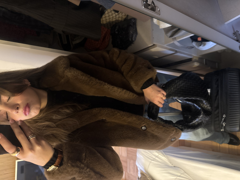 A woman wearing a brown faux fur coat holds a black woven leather bag. She wears several rings and a gold watch with a brown leather band. A black suitcase is visible next to the bag. The woman appears to be in a bedroom, with a bed nearby. A closet with clothes and bags is above her. The scene is lit by natural light.