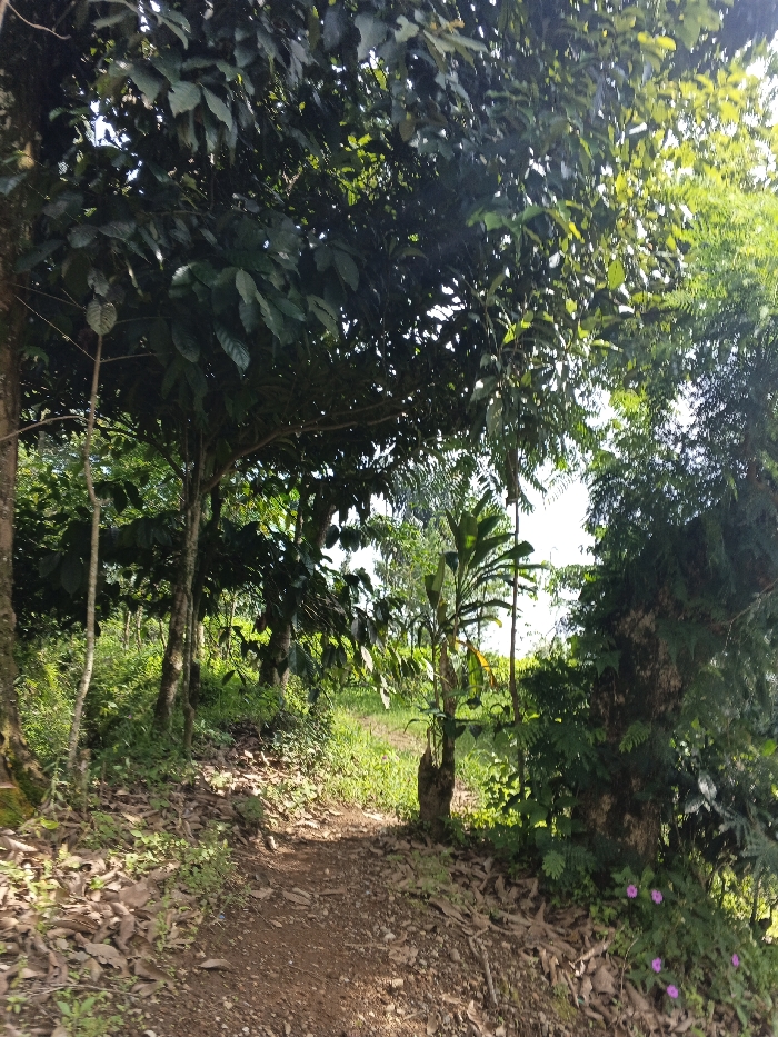 A dirt path winds through a lush, green landscape. Trees with dense foliage create a canopy overhead, filtering the sunlight. Undergrowth and small plants line the sides of the path, including flowering vines. The path itself is covered with leaves and soil. A variety of tree types can be seen, including palms. The scene evokes a sense of natural beauty and tranquility.